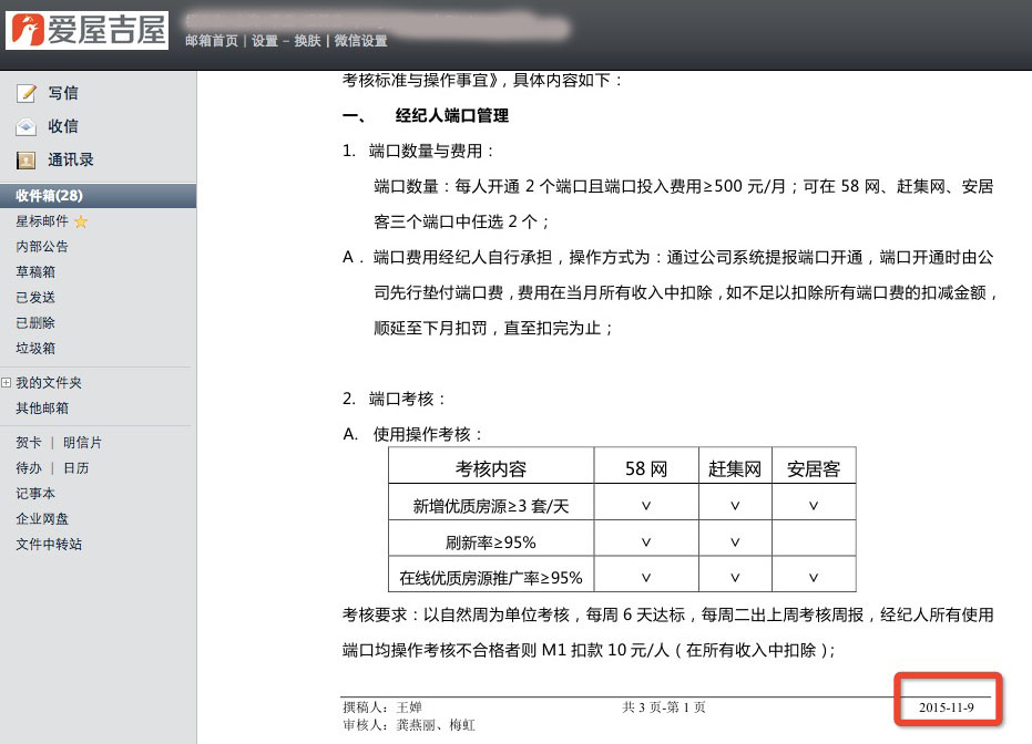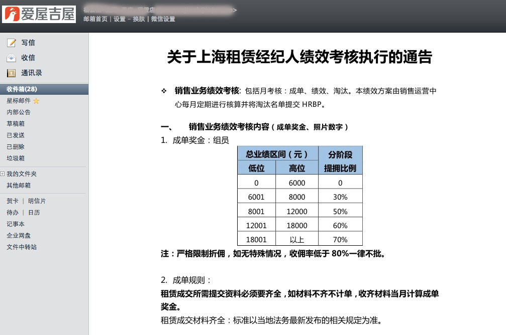人均2000左右的绩效拖欠只是导火索。11月10日,爱屋吉屋再一次发布绩效改革邮件:在租赁部,原先按签单量拿提成的日子已经不再;基本业绩要做到佣金6000元,你才可能“保命”。