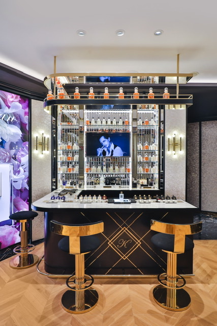 与馥马尔一墙之隔的就是凯利安(Kilian)。凯利安的店内装饰风格则古典奢华得多:主墙面铺上了黑色漆木,店面正中间是玻璃镜面陈设的香氛吧台,在强光照射下显得颇为夺目。这样的视觉体验并不算新颖,会引发一些关于竞品的联想,比如Dior的“真我香水”,又比如娇兰的“一千零一夜”。