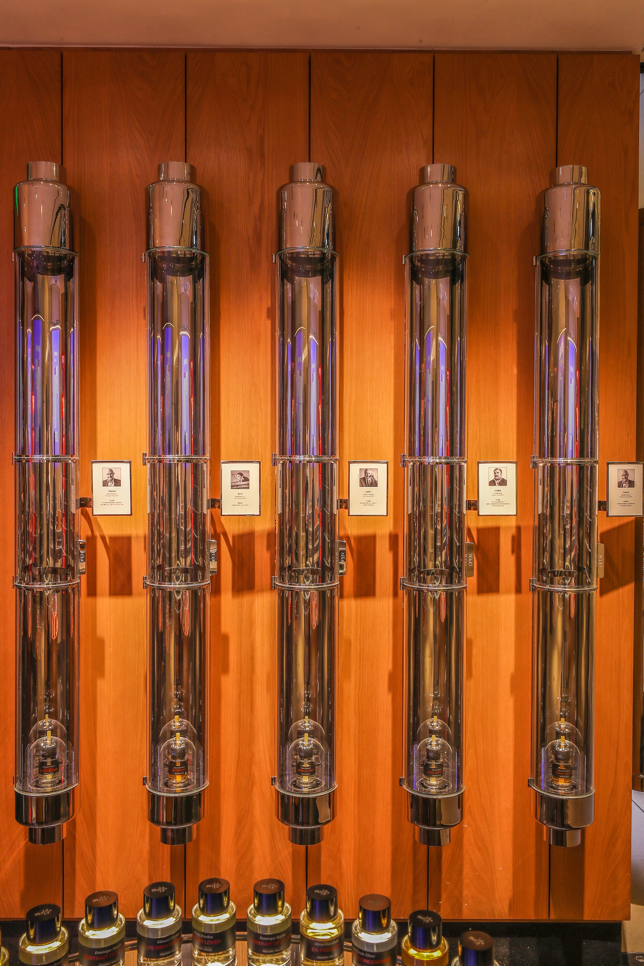 而被垂直放大的透明试管被并列镶在墙上,供消费者试香。一面是书架,一面是化学实验器材,馥马尔想要传递的制香专业性令人一目了然。