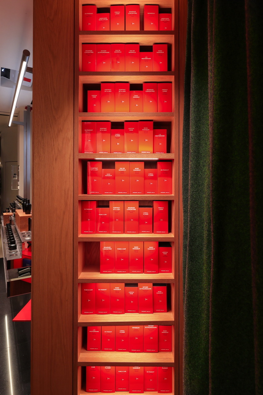 如果中国消费者曾经逛过馥马尔在巴黎、纽约等海外精品店,应该可以在中国首店内看到类似的陈设:跟出版物一样的香水包装盒摆放在陈列柜上,看起来像一面书架。