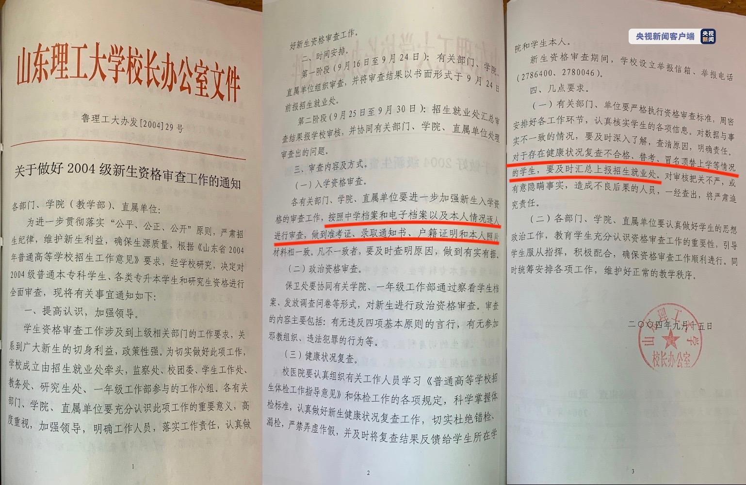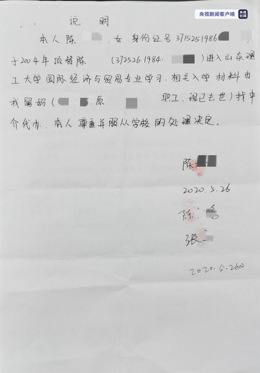 6月16日,记者从山东理工大学了解到,2020年5月26日,山东理工大学曾派人到山东聊城冠县调查“冒名顶替上大学”事件,在见到顶替者陈某某后,陈某某及其家人承认了冒名顶替他人上学的事情,并手写了一份情况说明,其中提到“相关入学材料由我(陈某某)舅妈(原某厂职工,现已去世)找中介代办”。