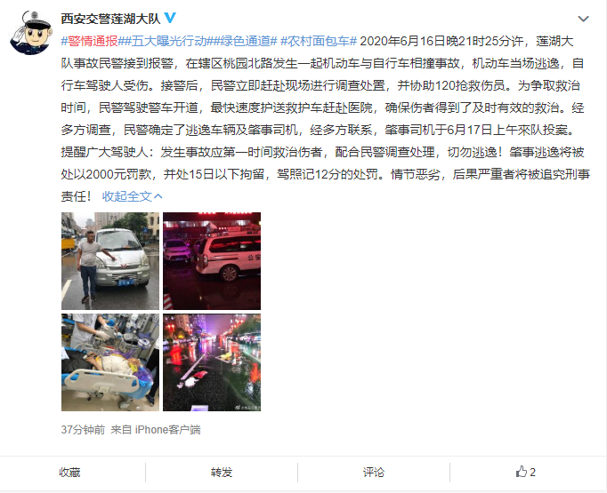 陕西省西安市交通警察支队莲湖大队官方微博6月17日发布警情通报称,2020年6月16日晚21时25分许,莲湖大队事故民警接到报警,在辖区桃园北路发生一起机动车与自行车相撞事故,机动车当场逃逸,自行车驾驶人受伤。接警后,民警立即赶赴现场进行调查处置,并协助120抢救伤员。为争取救治时间,民警驾驶警车开道,最快速度护送救护车赶赴医院,确保伤者得到了及时有效的救治。经多方调查,民警确定了逃逸车辆及肇事司机,经多方联系,肇事司机于6月17日上午來队投案。提醒广大驾驶人:发生事故应第一时间救治伤者,配合民警调查处理,切勿逃逸!肇事逃逸将被处以2000元罚款,并处15日以下拘留,驾照记12分的处罚。情节恶劣,后果严重者将被追究刑事责任!