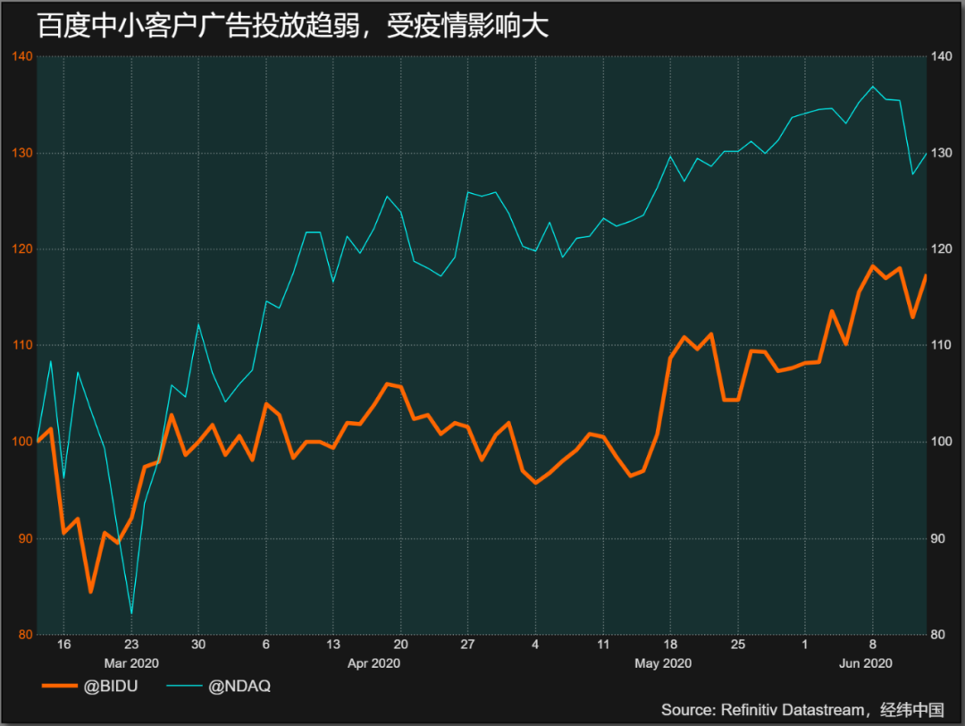 余正钧:医疗广告的收入受线上和线下两方面影响,一是我们看到的流量,二是线下医疗活动的数量。如果医院现在不开放,那么他们很难来到百度投放广告或是购买潜在客户等。因此在一季度,医疗保健业务的收入占比下降,不到百度核心广告收入的10%。