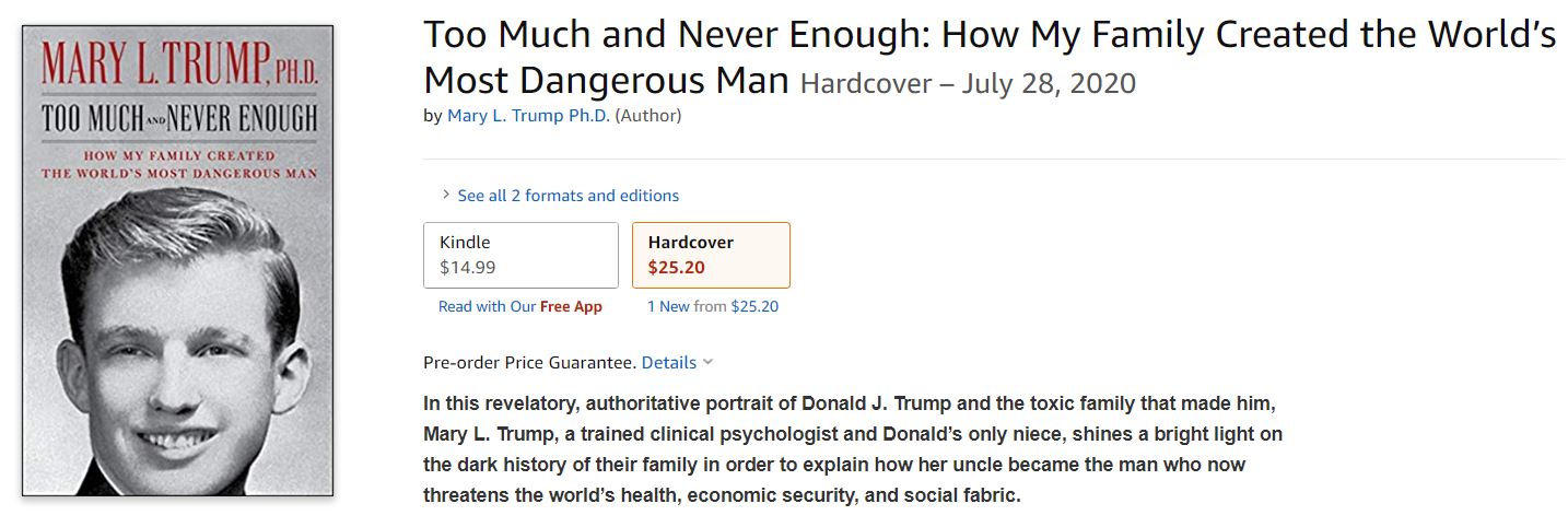 根据亚马逊网站的简介,这本回忆录将首次以家族成员的亲身经历揭露特朗普家族的“黑暗历史”,以解释特朗普如何成为现在这个威胁全球健康、经济安全和社会结构的美国总统。