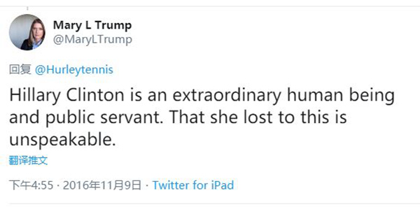 上一次玛丽现身媒体是在2000年,她与弟弟弗雷德三世(Fred Trump III)就祖父老特朗普的遗嘱发起诉讼,指控特朗普和其他亲属乘老特朗普痴呆之际实施诈骗。
