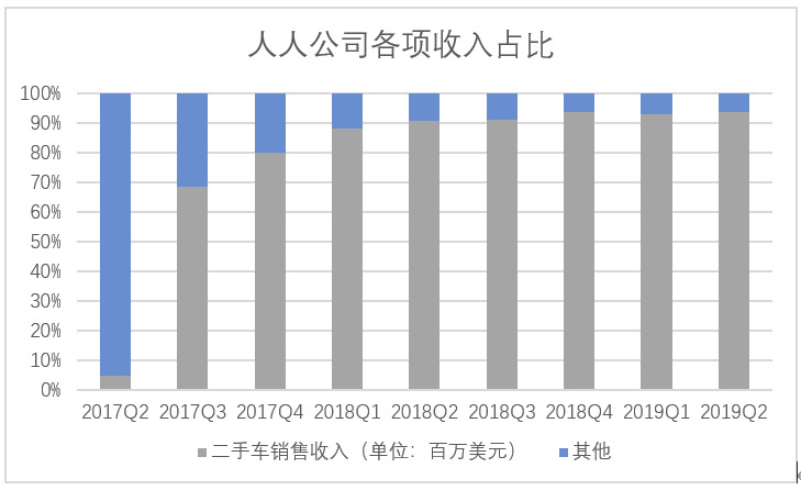虽然在公司官网的介绍中,人人公司“聚焦行业互联网,围绕房地产、汽车两大领域,业务板块主要包括二手车业务、海外SaaS业务”,但从财报中可以看出,2018年11月14日,人人公司以2000万美元将人人社交网络全部资产出售给北京多牛互动传媒股份有限公司后,其营收来源日渐单一,几乎是一家纯二手车公司。