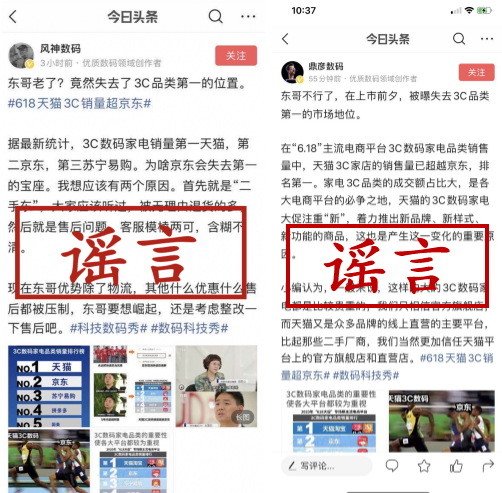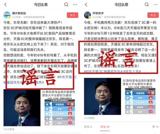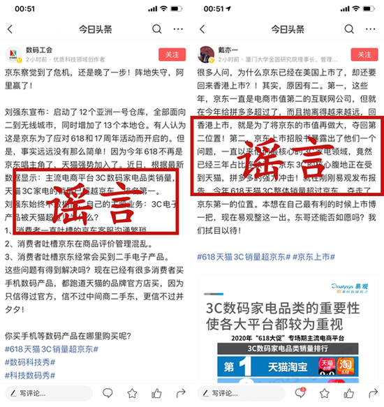 今天,我们注意到易观发布了所谓《618主流电商平台3C数码家电品类销量监测》的报告。声称某平台3c家电销量超越京东,与此同时,我们在社交平台上发现大量营销号整齐划一地围绕此内容对京东及京东员工进行诋毁谩骂,带有明显操控舆论的黑公关痕迹!对此我们特声明如下: