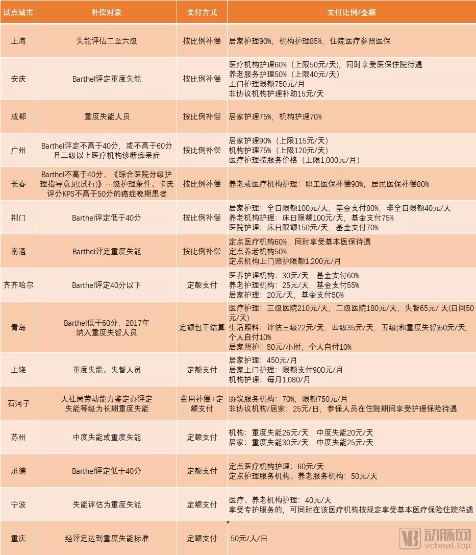 图为先期15个试点城市长护险的支付情况,动脉网整理