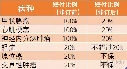 当然,也有部分以往的重疾被剔除保障范围,或者减小了赔付比例。其中就有大家之前经常讨论到的甲状腺癌,由修订前100%的赔付比例调整为20%,而原位癌和交界性肿瘤这两种轻型疾病则从重疾险的保障范围中完全剔除。