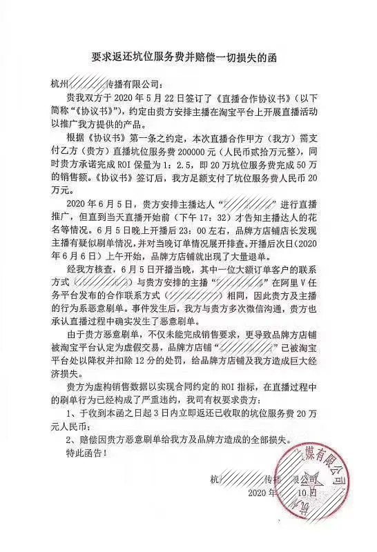 此前,也有媒体曝出,某品牌向MCN机构支付大金额的坑位费后,签订ROI保量为1:2.5,然而在实际的销售过程中,出现大量刷单退单的现象,甚至导致品牌方店铺被平台判定为虚假交易,进行降权处理。