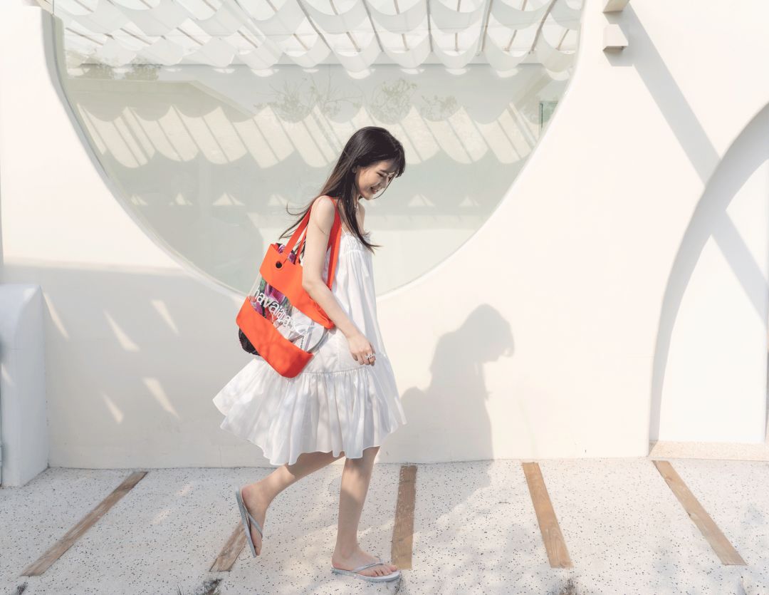 我觉得它可以适应好多种搭配,像种平衡剂一样。穿长裙的时候搭一双人字拖,会让裙装显得没那么隆重,变成悠闲的度假风。