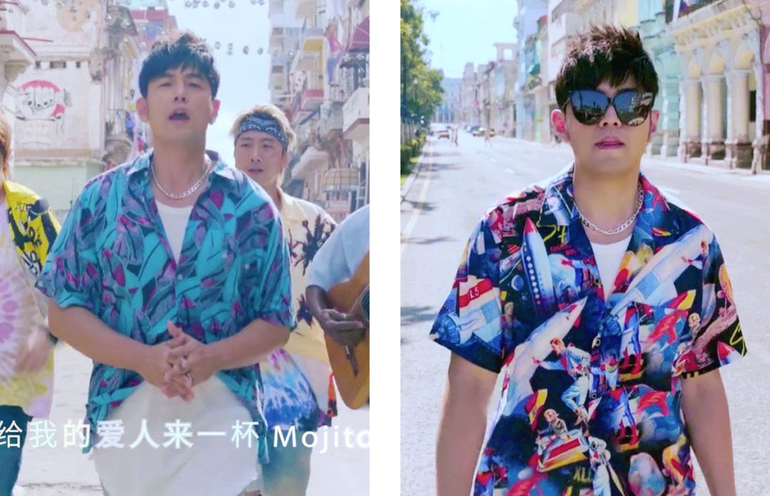 喜欢走暗黑暴发户风的他……不知道是不是因为爱情太滋润,MV里连换了3件花衬衫,据说是从纪念品店淘来的,还循环利用,跟昆凌度假也在穿。
