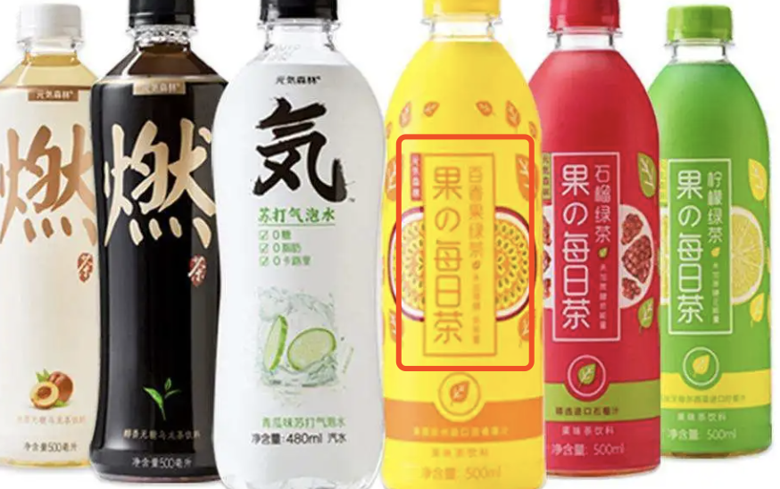 眼尖的朋友也发现,商标里不是通常的“元气”,而是用了日文的“気”这个字,以及“果の每日茶”这样的日语表述。