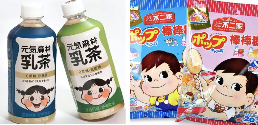 还有这款乳茶的形象设计,其包装上的女孩和日本原本的“不二家”品牌很相似。