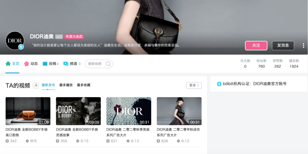 尽管Dior入驻B站,但从观看数据和关注数据来看,依旧差强人意,似乎Dior还不懂如何在B站与年轻用户的交流方式,又或者是太过“端着”不敢放开来玩。截止6月17日,Dior的B站账号粉丝数仅760人,最高的一直视频播放量也仅800多。