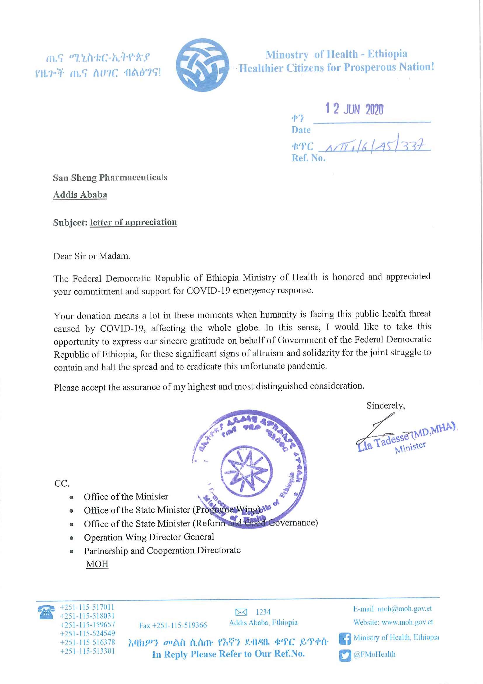 信文内容如下:埃塞俄比亚卫生部非常荣幸和感激你公对新型冠状病毒肺炎(COVID-19)紧急响应做出的贡献和支持。在人类面临新型冠状病毒肺炎(COVID-19)引发的波及全球的公共卫生威胁之际,你公司的捐赠意义重大。有鉴于此,我谨借此机会代表埃塞俄比亚联邦民主共和国政府对为遏制和制止这一不幸的流行病的蔓延和根除这一流行病而进行的共同斗争所表现出的利他主义和团结精神表示衷心感谢。请接受我最崇高的敬意。