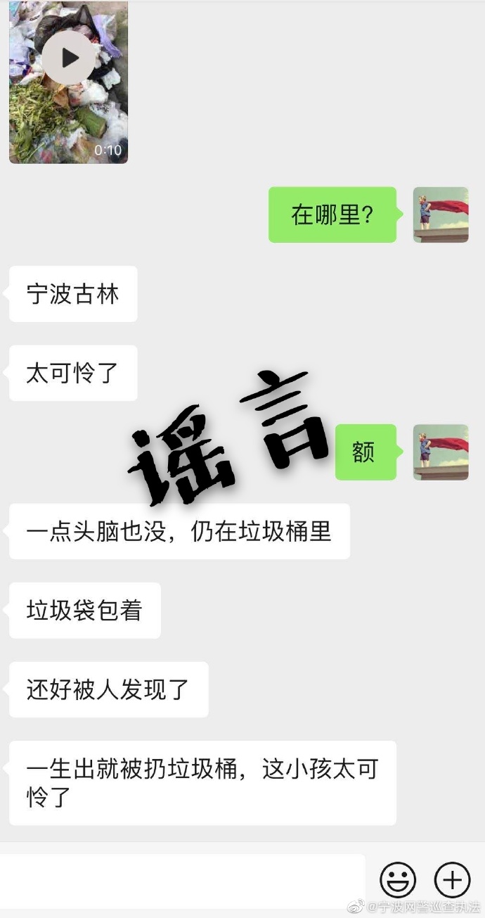 据宁波网警巡查执法,今日,一条关于宁波古林发现弃婴的消息在本地微信群传播,并配有一段10秒钟的视频。视频显示,一黑色垃圾袋内装着一名疑似出生不久的婴儿,并混杂有不少白色纸巾。经核实,宁波本地并未接到类似警情,以上消息为谣言。另发现,该视频也移花接木至南充等其他城市,经查询发现网传视频疑似发生在福建福州,据福州当地媒体报道,目前女婴已被送往医院救治。