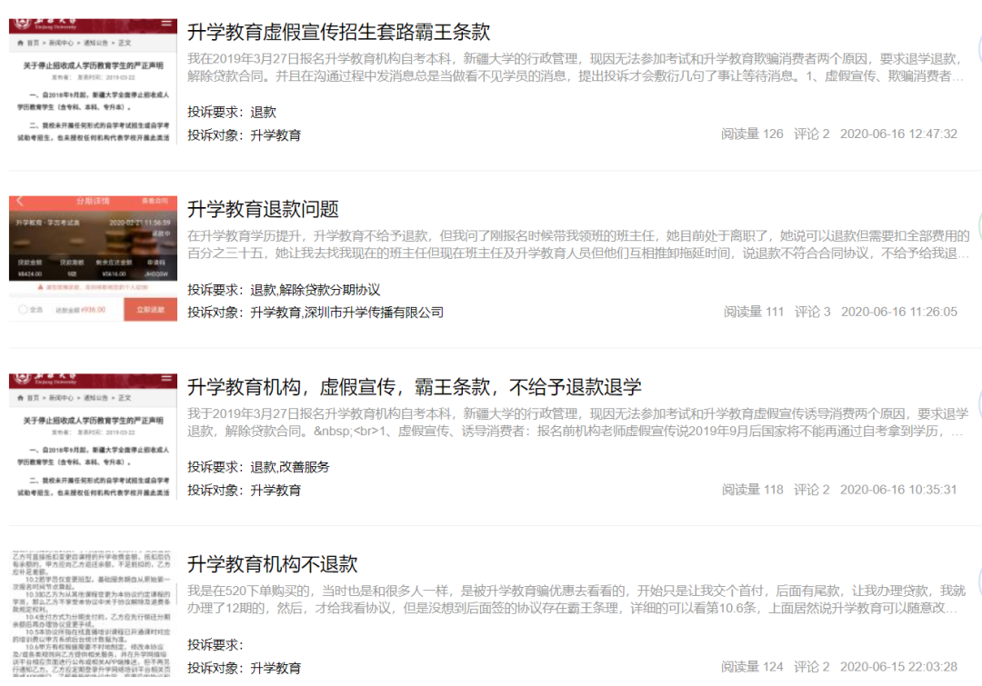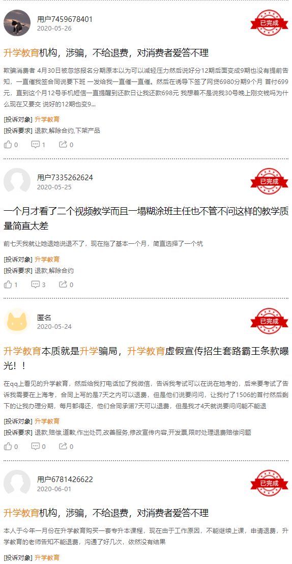 有消费者在6月8日投诉称,“深圳市升学教育于2020年5月19号联系本人推荐专本套读, 告知2.5年可以全部结业,经本人同江苏自考办确认,大专同本科考试时间有冲突,不可能2.5年结业,深圳升学教育存在虚假宣传及欺骗性入学。本人5月22号缴纳558元学习注册费及10614教育费。5月28号申请退学退费,升学教育班主任及售后客服互相‘踢皮球’进行推脱,并告知退学需收取总费用25%注册费,且申请退费截止目前一直没有兑现。”