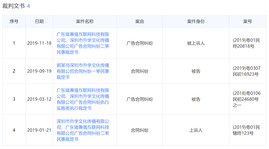 百度信誉显示,升学教育仅在去年一年就收到4份裁判文书,案由为“广告合同纠纷”和“民事合同纠纷”。