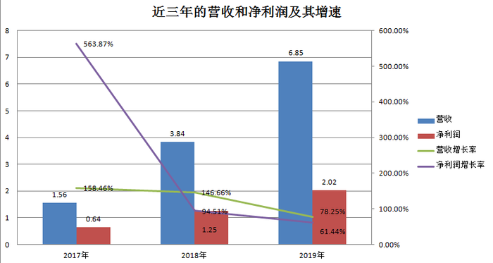 根据睿创微纳披露的财报,2019年,睿创微纳营业总收入约6.85亿元,同比增长78.25%,归母净利润约2.02亿元,同比增长61.44%,虽然依旧保持高速增长,但增速较前几年明显下滑,2017年和2018年,公司的营收增速分别为158.46%和146.66%,归母净利润增速分别为563.87%和94.51%,随着公司盈利规模和体量的增大,增速下滑似乎是一个必然的过程。