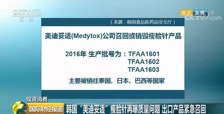 根据央视财经等报道,韩国食品医药品安全厅(食药厅)消息,韩国生物制药公司美得妥(Medytox)生产的A型肉毒毒素Meditoxin®(Neuronox)将于6月25日起被撤销批准文号,同时还对该公司处以1.746亿韩元(约合人民币102万元)的罚款。