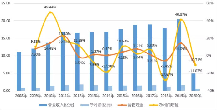 2008-2020年加加食品营业收入与净利润变动趋势(单位:亿元,%)