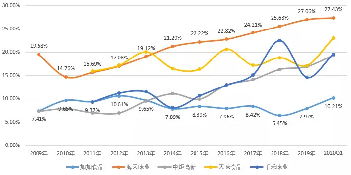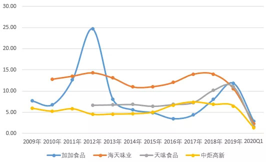 细扒财务指标可以发现,自2013年开始加加食品的利润率在行业中处于垫底的位置,相较后来上市的海天味业,2019年利润率相差近20个百分点。相较同样布局高端产品的千禾味业,相差6个百分点。