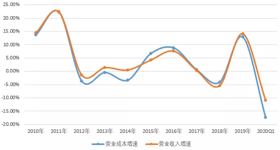 2010-2020年加加食品营业收入与营业成本增速走势(单位:%)