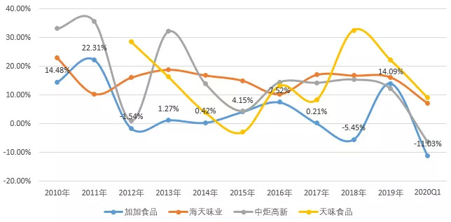2010-2020年加加食品与同业竞争者营收增速走势对比(单位:%)