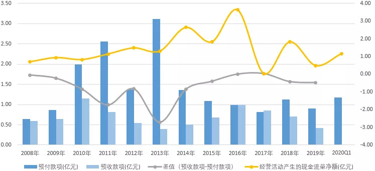 2008-2020年加加食品预付款项和预收款项的走势(单位:亿元)