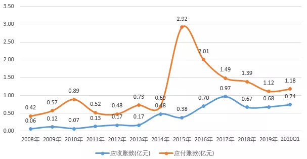 2008-2020年加加食品应收账款和应付账款的规模(单位:亿元)