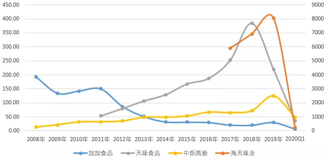 很显然,相较于海天味业对经销商霸道式“先款后货”的模式,加加食品采用的先货后款方式,一方面对公司的现金流形成压力,另一方面映射出的是加加食品在行业中的市场地位下降。这也是加加食品在上下游合作中丧失话语权的原因。
