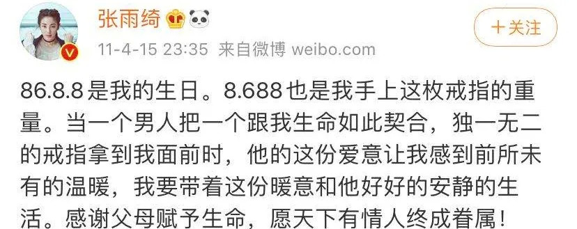 但张雨绮还是坚持发了,和第一次结婚时一样,要伴着他一起走下去的微博。