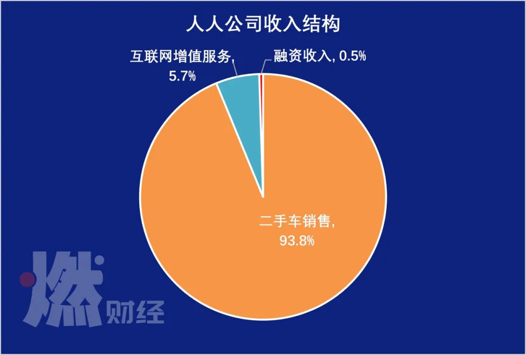 从收入构成来看,2017年,二手车销售在人人公司总收入中的占比,就已经达到了60%,2018年将人人网出售后,二手车销售收入占到94%。