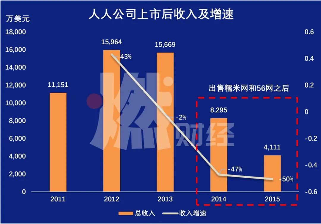 卖掉糯米和56网后,人人公司的整体规模迅速缩小。2014年,人人公司的收入减少到8295万美元,相比上市时缩减了三成。2015年,它的收入再次腰斩,缩减到4111万美元。