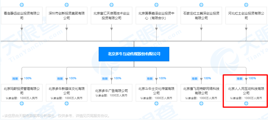 天眼查数据显示,多牛传媒在2016年3月挂牌新三板,是中国新三板市场中第一支传媒大数据股。目前,多牛传媒旗下有六家全资子公司,其中一家是北京人人网互动科技有限公司。