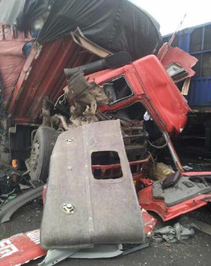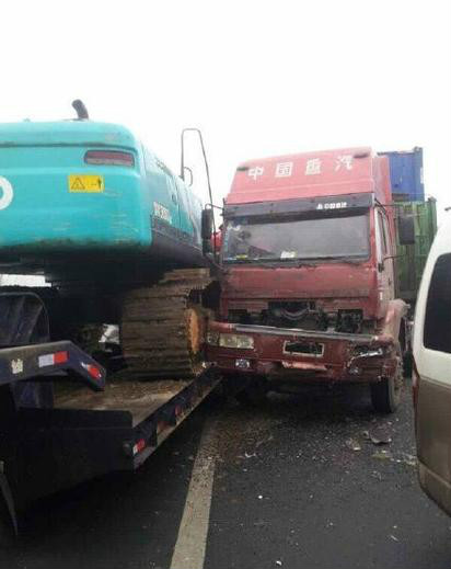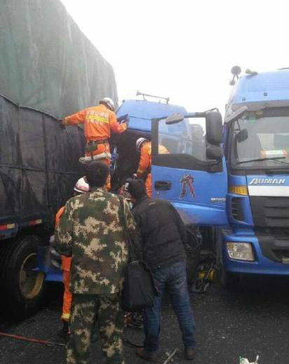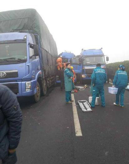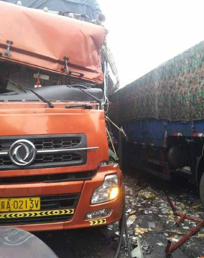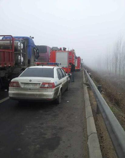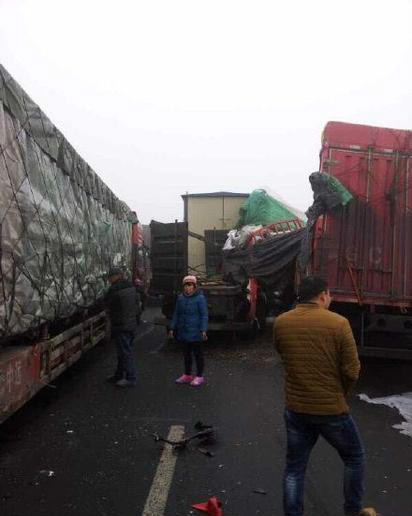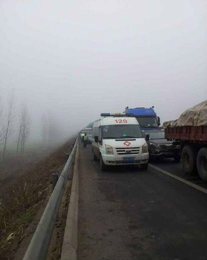 今日上午9点30分,许平南高速公路平顶山服务区一公里处,由北向南至少7辆大货车发生连环追尾事故,事故现场造成一死一伤。事故原因是因为大雾造成的。