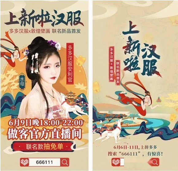 6月9日18点,一场由拼多多联合敦煌莫高窟壁画和曹县汉服,共同推出的“多多汉服×敦煌壁画”新品首发活动——“壁画变为现实”,在拼多多服饰类目官方直播间上演。整个拼多多618电商活动期间,包括多多汉服在内,一系列名为“上新啦!汉服”的活动都将作为官方主推,亦将展现在大众面前。