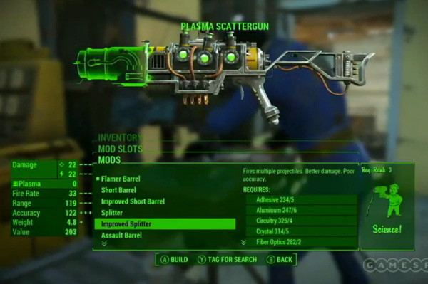 《辐射4》的装备系统与此前相比几乎是完全的进化。一方面,玩家可以为自己的装备增添各种各样的配件,通过更换枪械的零件改变武器的威力,为武器安装消声器,刺刀以备不同场合使用。另一方面,在游戏中会有带有特殊前缀的武器掉落,这些前缀往往代表着更加强力的效果——如果你拿到一个“双弹”的武器,就意味着每一次的攻击都可以造成双倍的伤害。也因此,我们在游戏过程中会时常有意地“刷”装备并改造他们。
