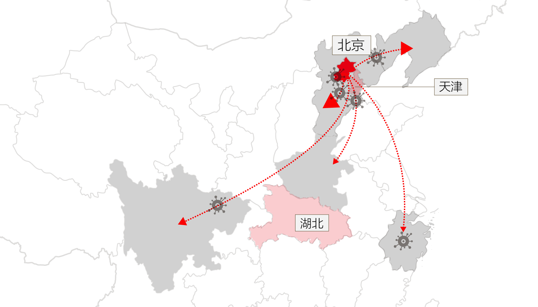 自6月13日以来,辽宁、河北、浙江和四川累计报告关联北京确诊病例共计21例。其中,河北最多,累计已达16例。