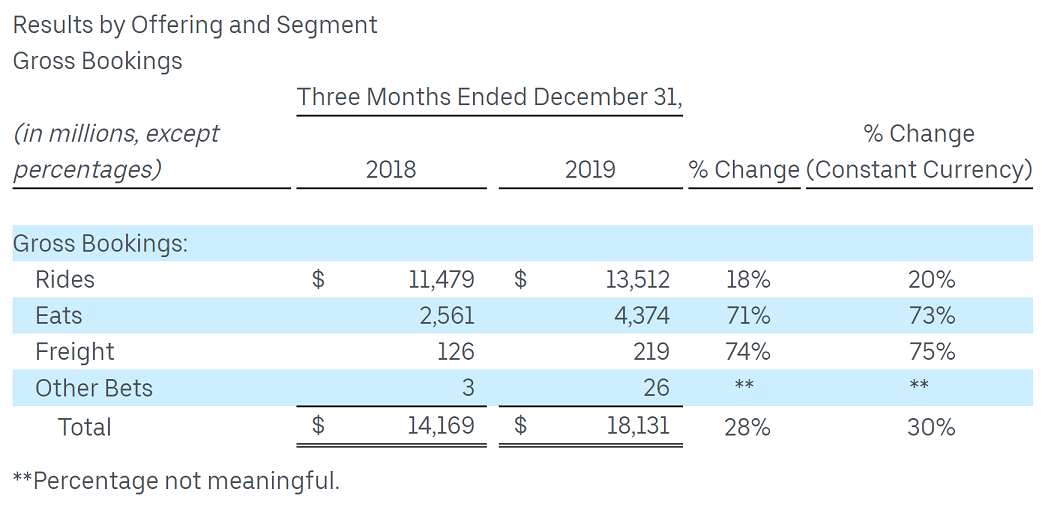 这是Uber在2014年就推出的外卖业务。在2019年四季度里,Uber外卖的总交易额为43.74亿美元,虽然总交易额仍低于乘车业务的135.12亿美元,但其高达71%的增速远超乘车业务的18%,毫无疑问是Uber旗下增速最快的业务之一。