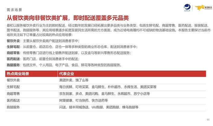 2019年,我国即时配送市场用户超4亿人。即时配送起源于餐饮外卖,目前餐饮外卖仍占据即时配送领域最大市场比例,但与此同时,零售便利、生鲜也在迅速扩大。2019年,配送订单总量超180亿单。目前,美团配送拥有活跃骑手超80万人,单日订单量超3000万单,业务范围覆盖2800个市县。美团正以外卖为基本盘,不断扩大生鲜、跑腿等配送服务。