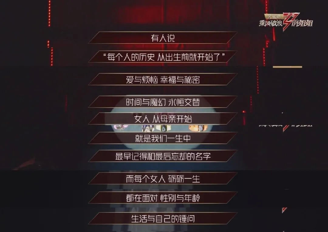 《浪姐》作为一档高能输出30+女性力量的真人秀,是需要优质的文案来开篇定调的。这个时候吴梦知的文案再度派上用场。观众几乎在一开头就识别出了吴梦知标志性的风格——语句平实,但不乏新鲜的用词:“女人,从母亲开始,就是我们一生中最早记得和最后忘却的名字。而每个女人,砺砺一生,都在面对性别与年龄、生活与自己的锤问……”