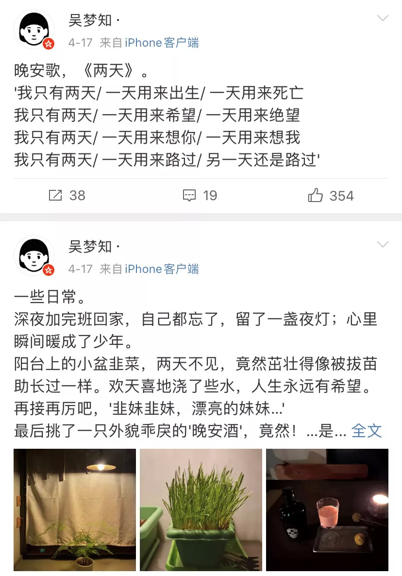尽管从《超级女声》时代吴梦知就是龙丹妮麾下干将,但不同于龙丹妮的女强人形象,吴梦知的微博画风十分文艺小清新,很难想象这些闲情逸致的文字背后是一个忙起来动辄通宵的综艺节目导演。