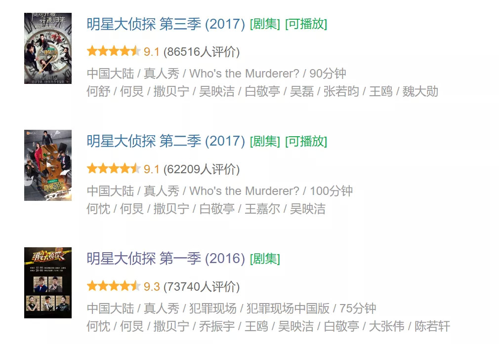 但也是在这一年,何忱团队制作出高分原创推理综艺《明星大侦探》,成为内地原创综艺难以逾越的一座高峰:豆瓣7万人评分9.3,在芒果TV月活只有4000万左右的2016年,首季收官前播放量超6亿,累计播放量13亿。这或多或少也打破了一类性别刻板印象:如此构思缜密、排布精细的推理真人秀,出自女导演之手。