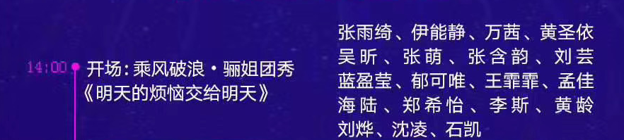 正值《姐姐》第二期开播的时节点,所以整场招商会的焦点还是在姐姐们身上。根据现场传出来的资料显示,包括张雨绮、伊能静、万茜、黄龄等16位姐姐带来开场歌舞《明天的烦恼交给明天》表演,相当于《姐姐》初舞台亮相。