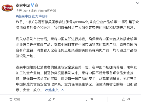 针对“海关总署暂停美国泰森(Tyson)公司注册号为P5842的禽肉企业产品输华”一事,泰森食品(中国) 通过其官方微博于22日发布声明称,中国海关总署发布公告后,泰森中国立即进行排查,确保泰森中国未曾从该禁止输华企业进口任何鸡肉产品。