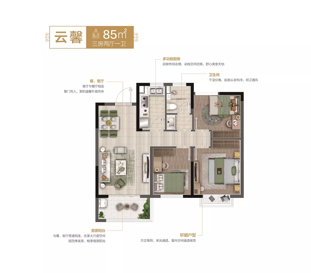 ▼建筑面积约85㎡A户型 三房两厅一卫