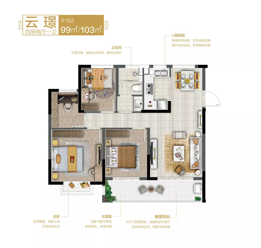 ▼建筑面积约99㎡/103㎡B1户型 四房两厅一卫