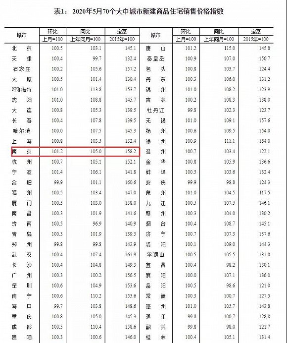 6月15日上午,国家统计局最新发布了2020年5月份70个大中城市商品住宅销售价格变动情况统计数据。其中,5月南京新房价格环比上涨1.2%、同比上涨5%,新房价格环比三连涨!